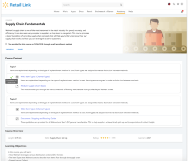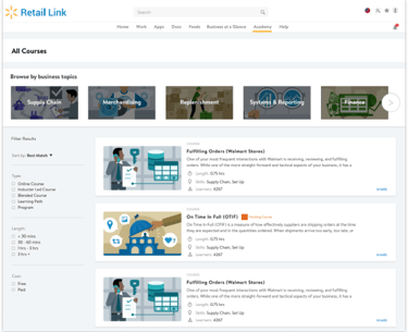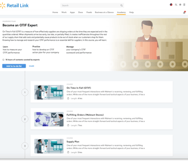 Retail Link® is an online hub for the data, documentation, reports, and special applications that suppliers use to manage their business with Walmart. Nearly 250k users from different supplier companies use Retail Link to manage their day-to-day business with Walmart. The Retail Link application is so vast and complex that users need to have a steep learning curve to use various features of the application. Various third-party companies train the users on how to use the Retail Link application. Walmart also has lots of training material that is not easily accessible to users. To resolve this issue, a separate Learning Management System to provide training to the Retail Link users.